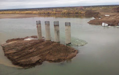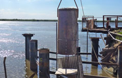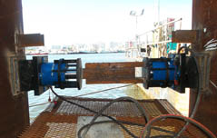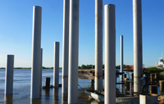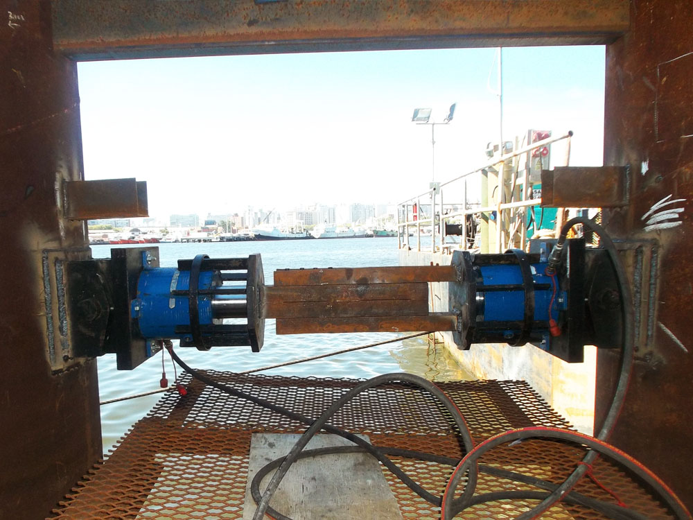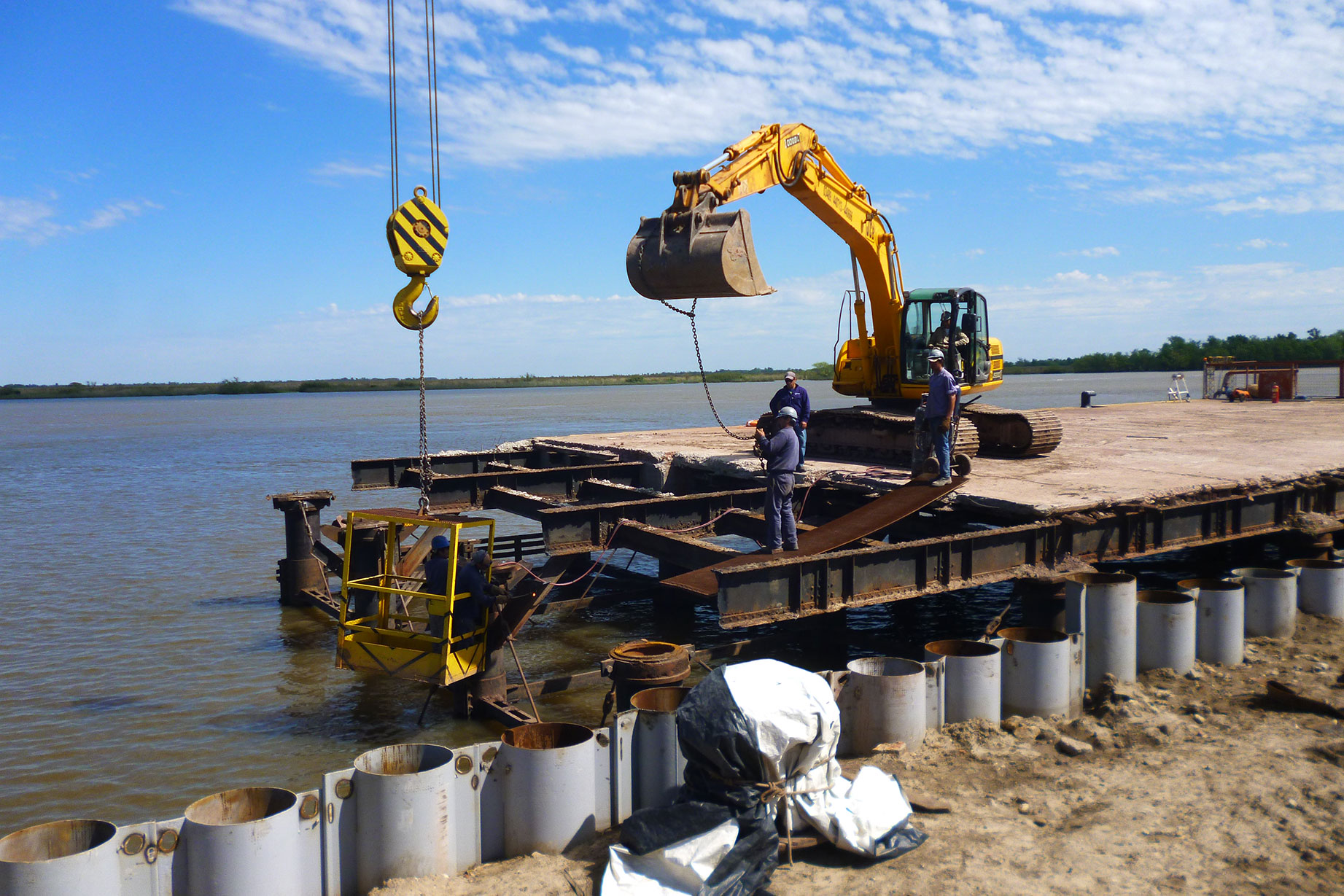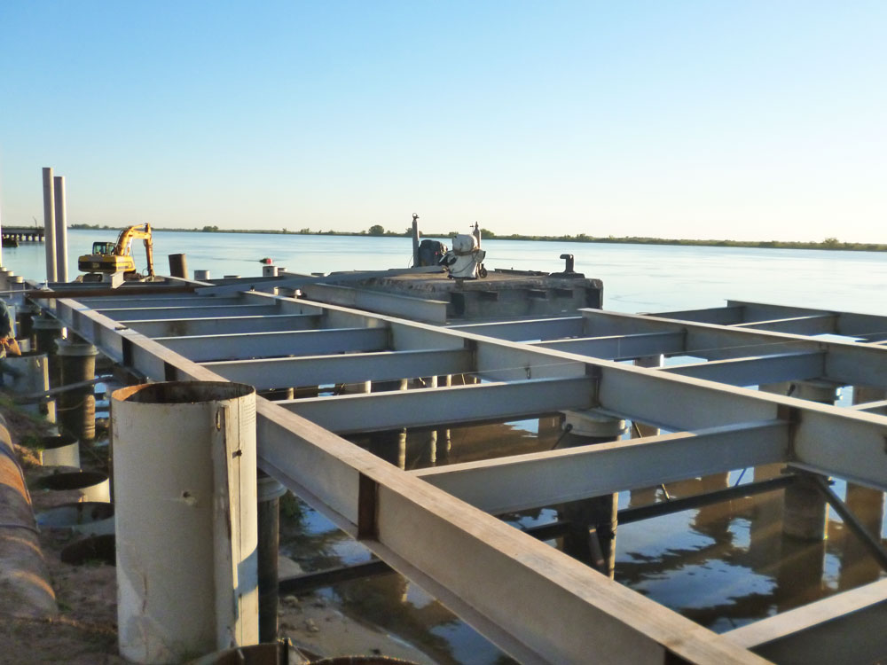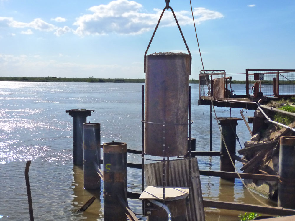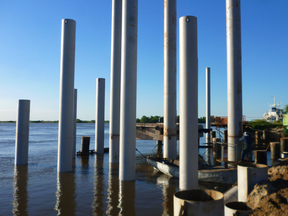 El muelle de ultramar de Puerto Ibicuy, provincia de Entre Ríos era una construcción de principios del siglo XX construida por los ingleses. La fundación estaba compuesta por camisas de fundición hincadas. Debido al dragado del fondo del río a los efectos de posibilitar el atraque de barcos de ultramar de mayor porte y calado a los existentes al momento de ejecutarse la obra, conjuntamente con el depósito de grandes cargas sobre el suelo atrás del muelle se produjo el colapso del talud arrastrando con ello la mayoría del muelle. Habiendo un tramo de 30 m que no colapsó se produjo la necesidad de evaluar el estado de dichos pilotes y su aptitud para la transmición de carga. Para esta tarea fue contratado Ensayos y Estructuras, y se realizaron pruebas de carga en casi la totalidad de lo pilotes sobrevivientes.